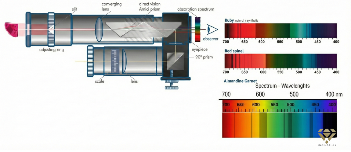 රූබි ගලට ඒ ලස්සන රතු පාට ලැබෙන්නේ "ක්රෝමියම්" නිසා. ස්පෙක්ට්රස්කෝප් එක මේකට හරිම සංවේදීයි.