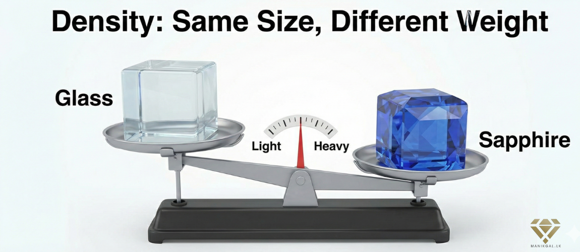 මැණික් ලෝකයේදීත් මේක එහෙමමයි. පෙනුමෙන් එක වගේ පෙනෙන නිල් මැණිකක් (Sapphire) සහ නිල් ටොපෑස් (Blue Topaz) ගත්තොත්, මේ දෙකේ බර එකිනෙකට වෙනස්.