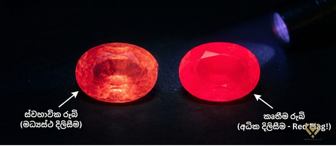 ඇත්තටම ස්වභාවික රූබි වලට වඩා, ලැබ් එකේ හදන කෘතීම රූබි (Synthetic Ruby) UV එළියට අසීමිතව දිලිසෙනවා.