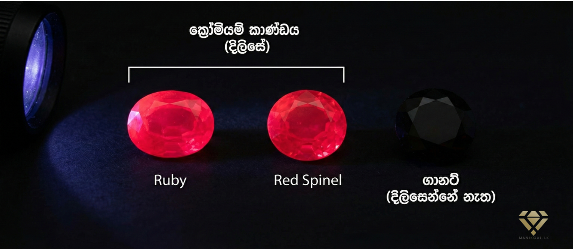 ඔබ රතු පාට ගලකට UV ටෝච් එක අල්ලනවා. ඒක ලස්සනට රතු පාටින් දිලිසෙනවා. "හරි! මේක රූබි (Ruby) එකක්ම තමයි!"