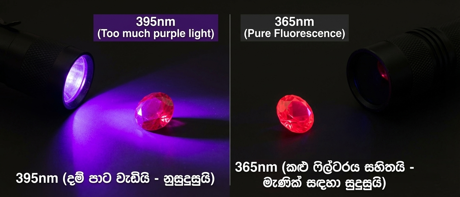 ඔබ කඩෙන් UV ටෝච් එකක් ගෙනත් රූබි එකකට ඇල්ලුවාම, මුළු ගලම දම් පාටට (Purple) පේනවා මිසක්, හරියට "රතු පාටට" දිලිසෙන්නේ නැද්ද?